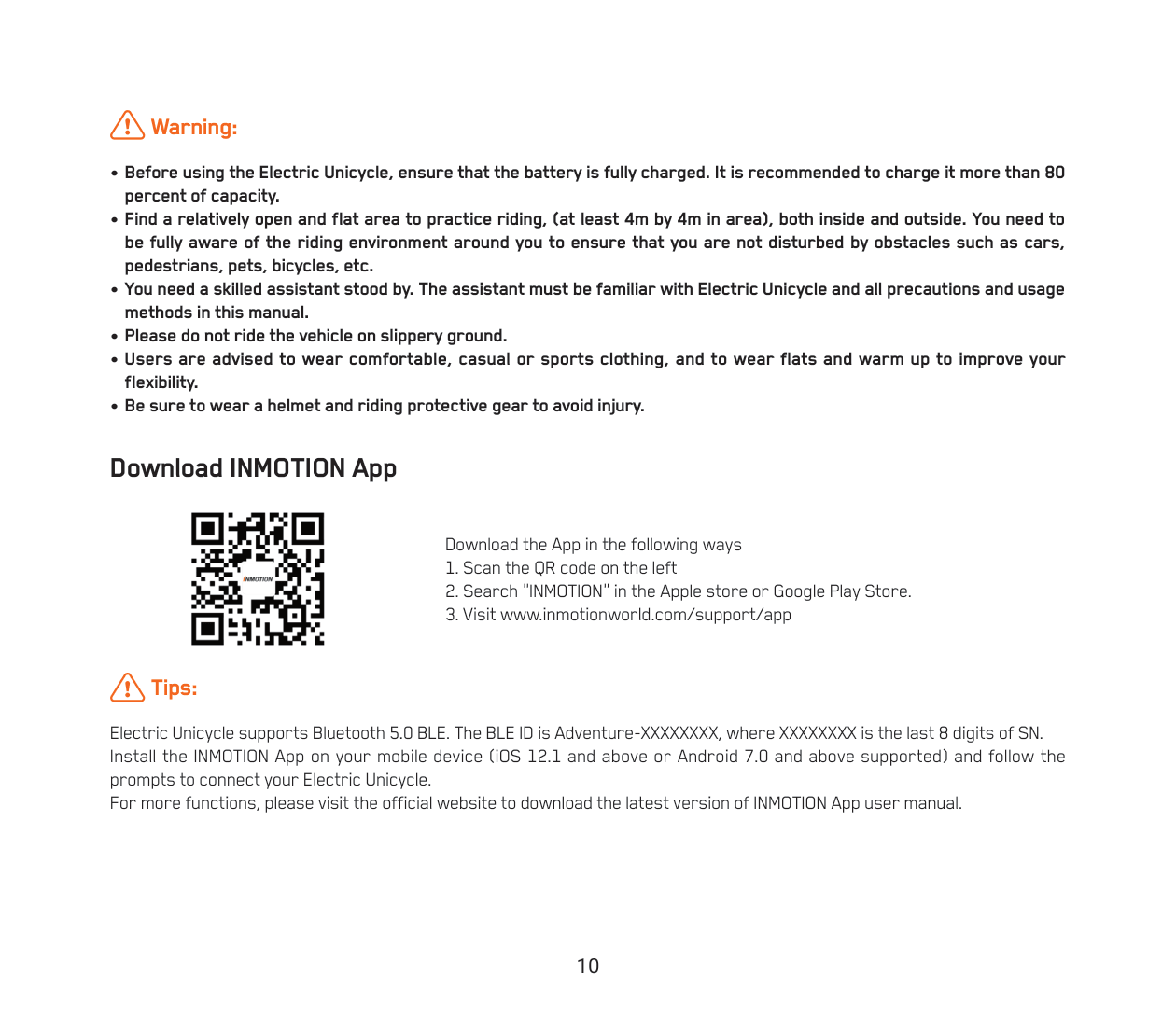 Electric Unicycle supports Bluetooth 5.0 BLE. The BLE ID is Adventure-XXXXXXXX, where XXXXXXXX is the last 8 digits of SN. Install the INMOTION App on your mobile device (iOS 12.1 and above or Android 7.0 and above supported) and follow the prompts to connect your Electric Unicycle.