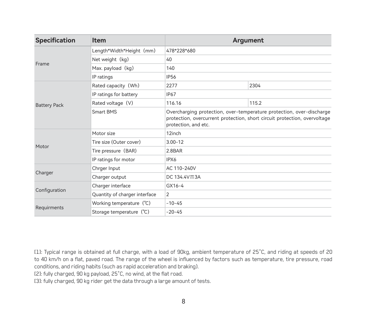 [1]: Typical range is obtained at full charge, with a load of 90kg, ambient temperature of 25°C, and riding at speeds of 20 to 40 km/h on a flat, paved road. The range of the wheel is influenced by factors such as temperature, tire pressure, road conditions, and riding habits (such as rapid acceleration and braking).