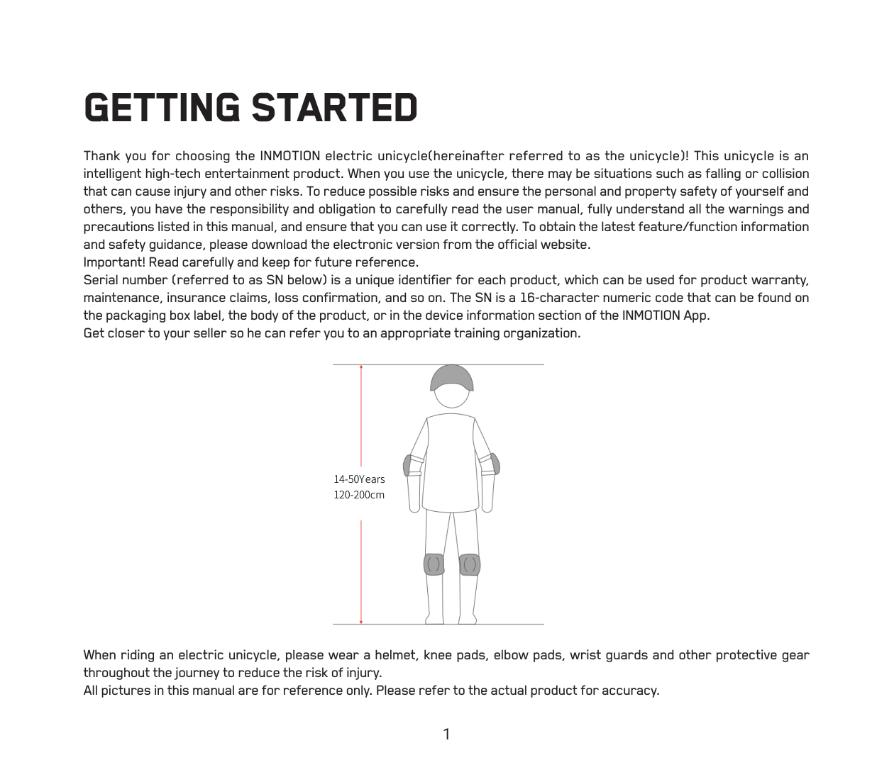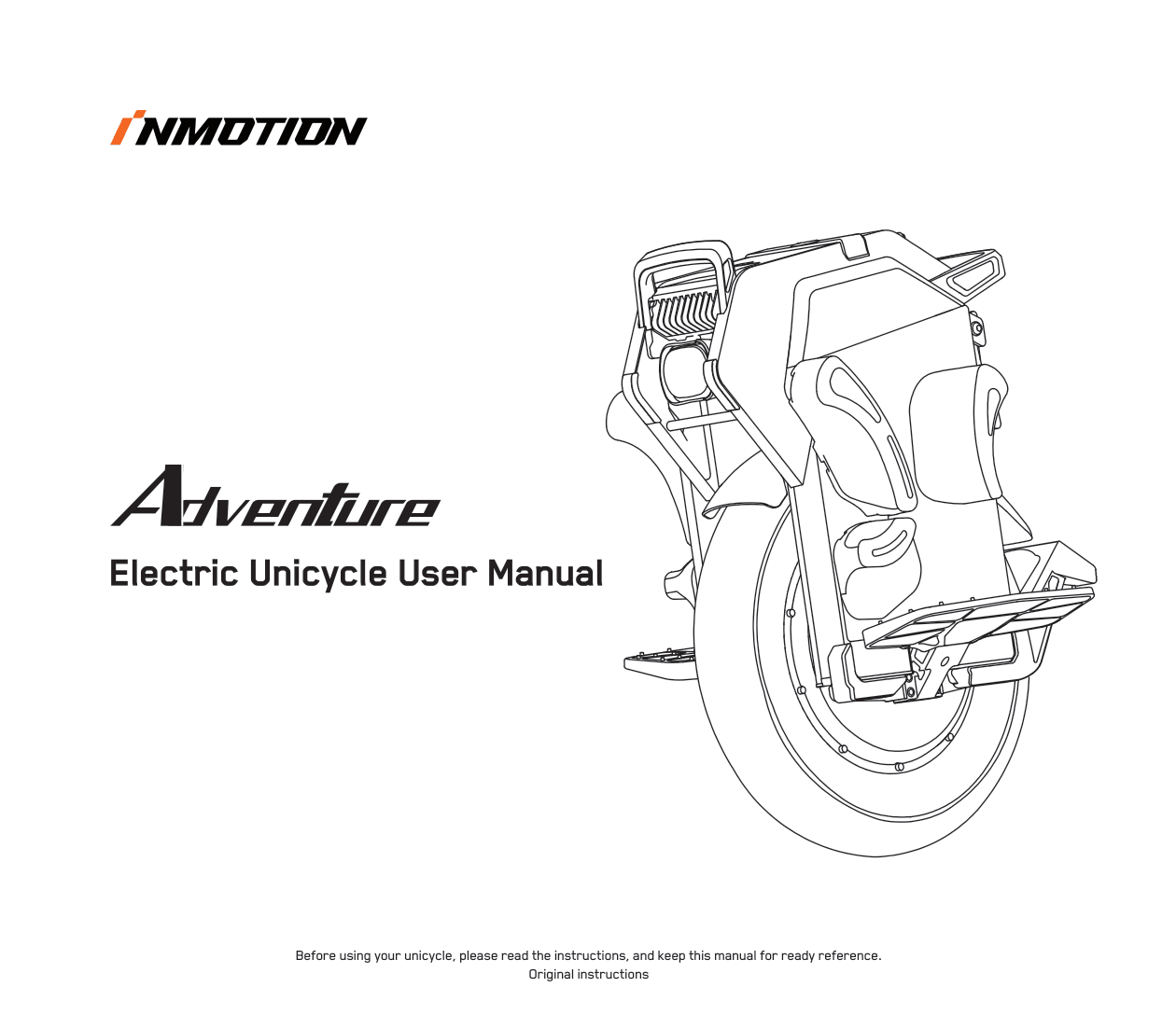 Thank you for choosing the INMOTION electric unicycle(hereinafter referred to as the unicycle)! This unicycle is an intelligent high-tech entertainment product. When you use the unicycle, there may be situations such as falling or collision that can cause injury and other risks. To reduce possible risks and ensure the personal and property safety of yourself and others, you have the responsibility and obligation to carefully read the user manual, fully understand all the warnings and precautions listed in this manual, and ensure that you can use it correctly. To obtain the latest feature/function information