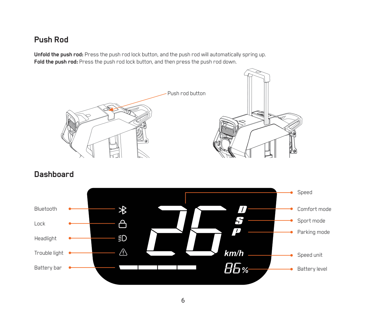 Unfold the push rod: Press the push rod lock button, and the push rod will automatically spring up.