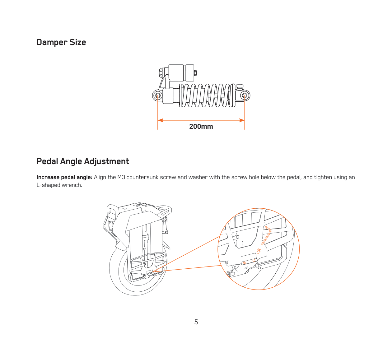Increase pedal angle: Align the M3 countersunk screw and washer with the screw hole below the pedal, and tighten using an L-shaped wrench.